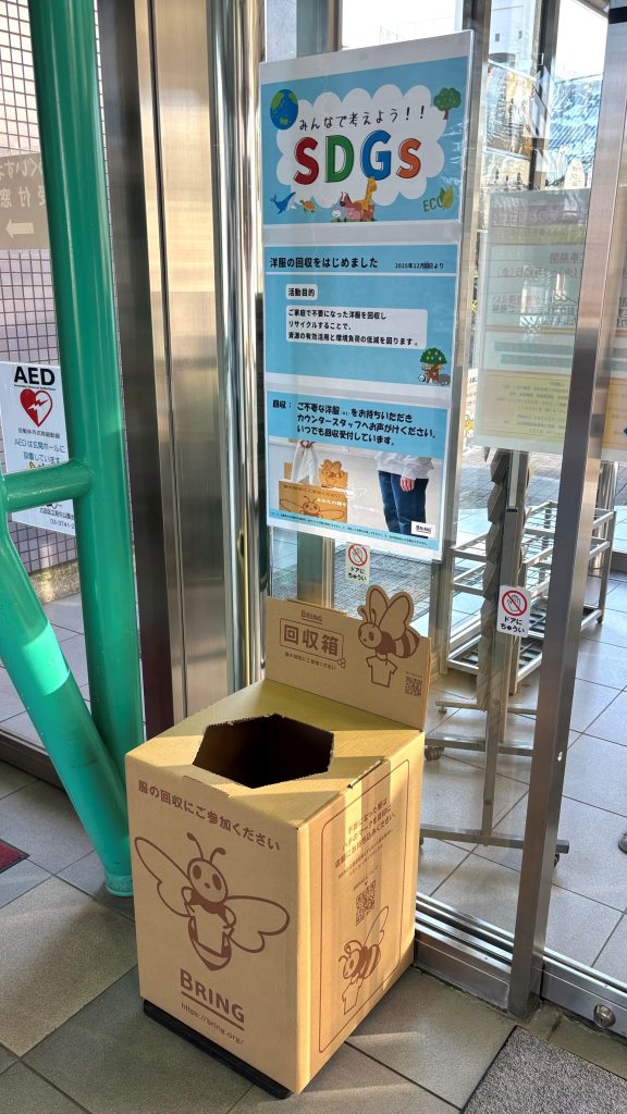 2025年12月10日より、館内入り口に洋服回収BOXを設置しました。 ご家庭で不要になった洋服を回収し、リサイクルすることで 資源の有効活用と環境負荷の低減を図ることを目的としております。 ★捨てる前にリサイクル★みんなで考えようSDGs★